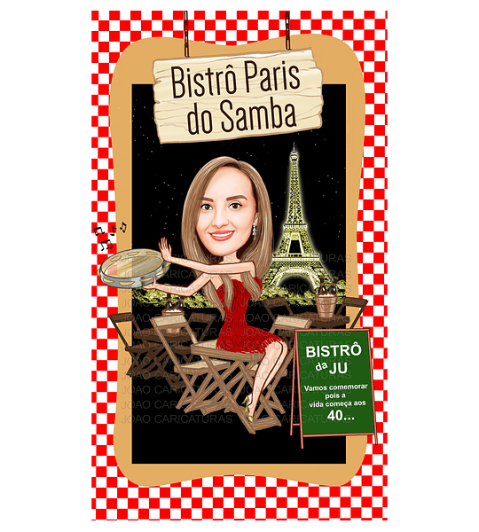 Caricatura convite Digital aniversário de mulher no tema Paris e Veneza. Feita através de fotos recebidas da aniversariante. Enviada por...
