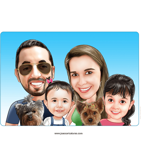 Caricatura Família toda (preço por pessoa) pai mãe filhos netos vovô vovó filho filha cães cachorrinho pet unidos abraçados juntos familiares